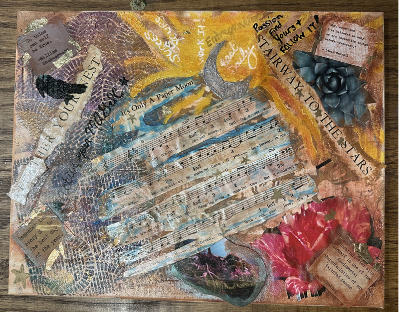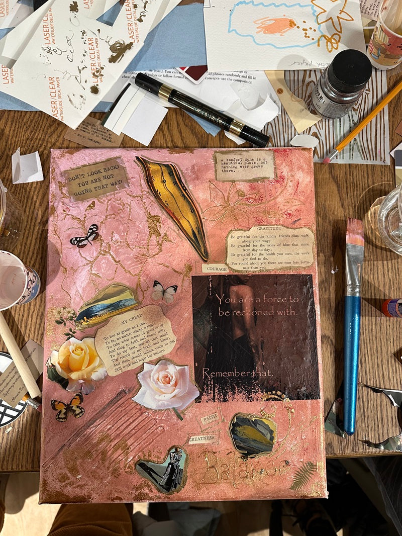 During the workshop, you'll start by personalizing a pre-treated, textured canvas with your choice of painting or staining. Then, delve into an array of high-quality art materials like water slide decals, metallic inks, gold leaf, and more, elevating your vision board to a work of art that resonates with your aspirations.