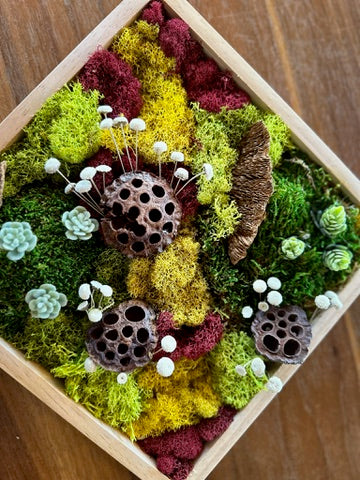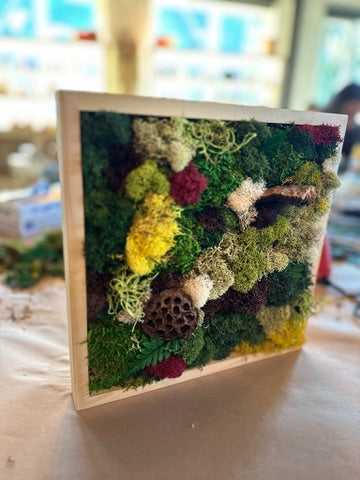 Each student will receive a 10"x10" wood frame and a variety of mosses and botanicals to create their own unique garden. These pieces are completely maintenance-free - no watering, no sunlight - just timeless, textural beauty for your walls.